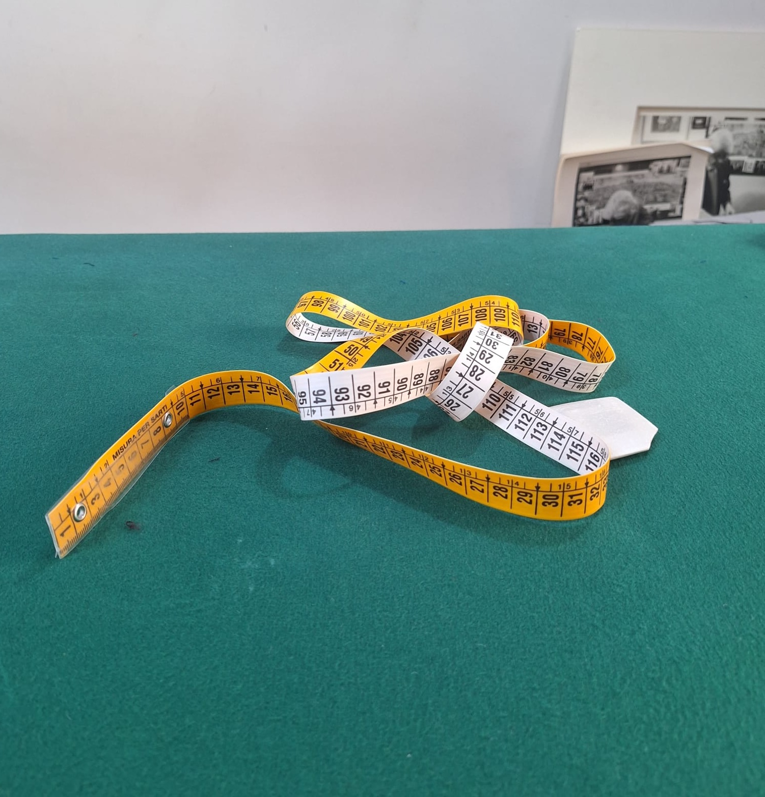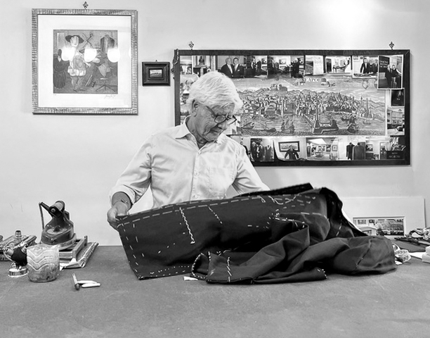 He first picked up tailor’s tools, at his father’s side, in 1955. Every surface in his workroom reflects decades of practice: chalk marks, paper patterns, shears, tape measure, thread, hand iron.