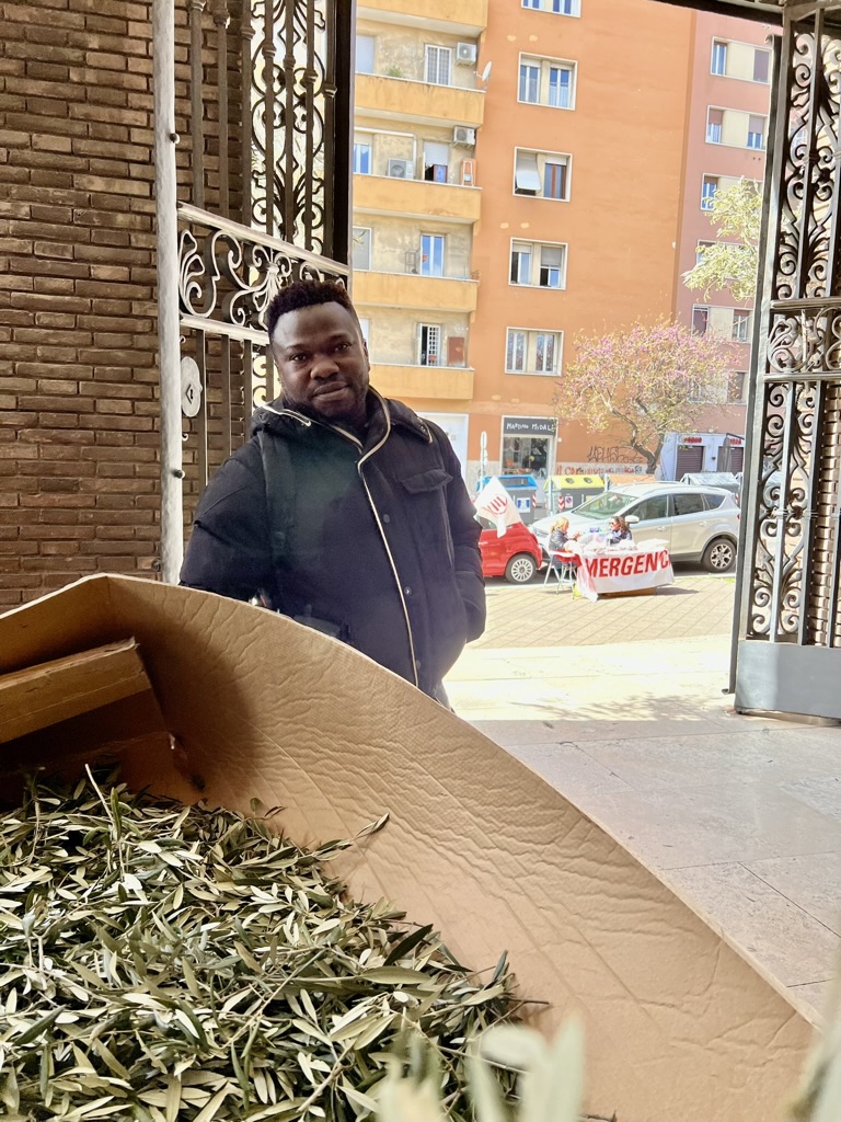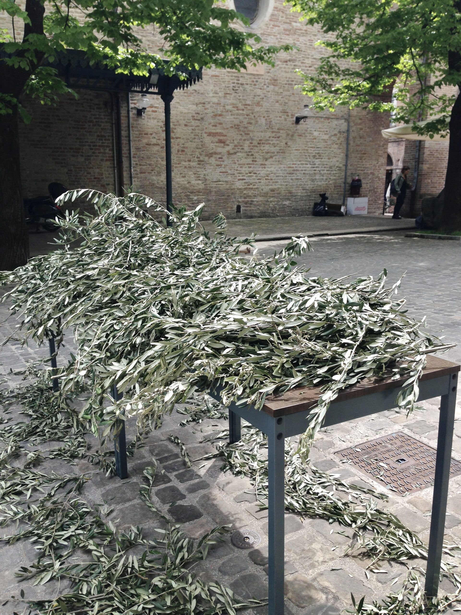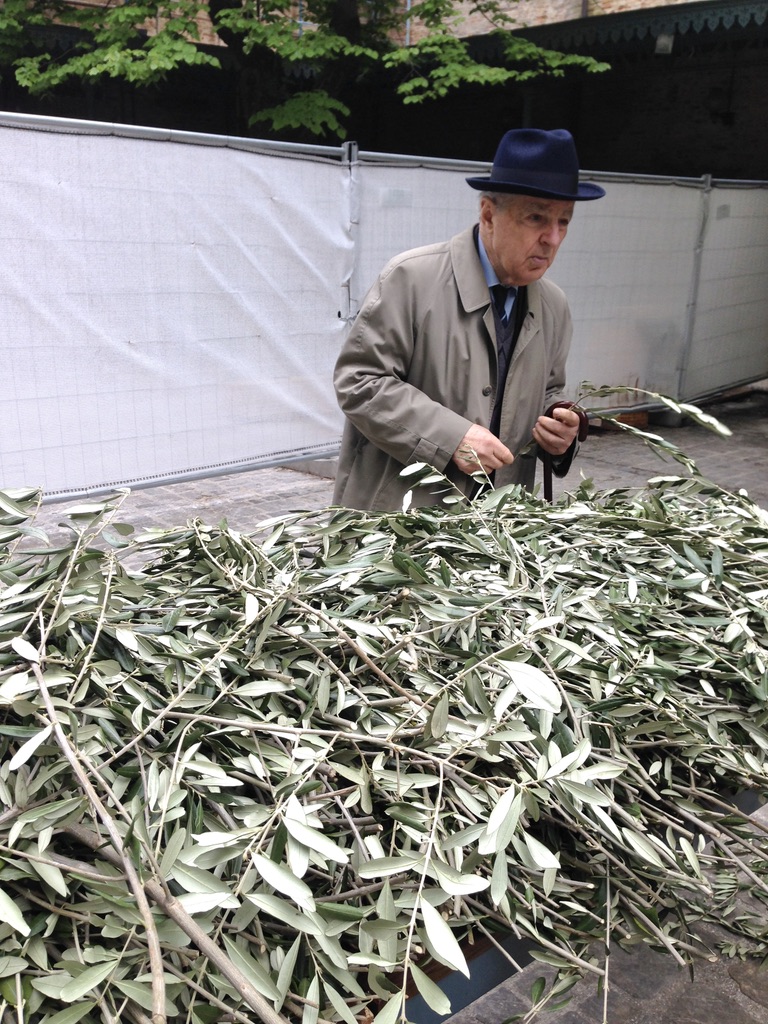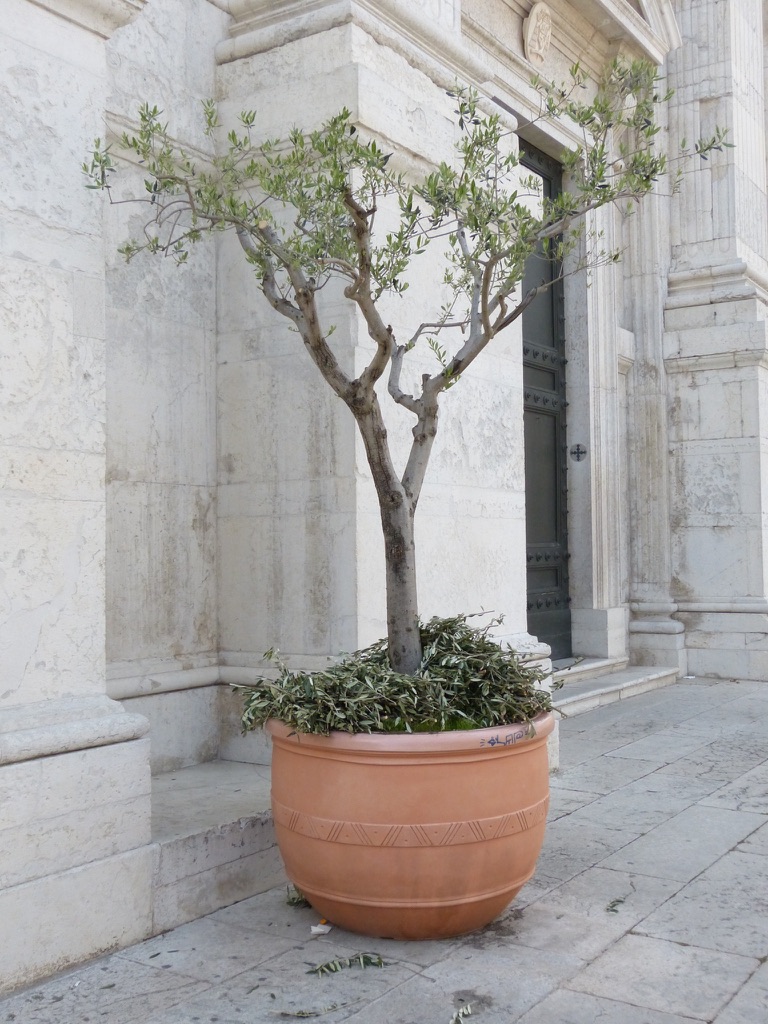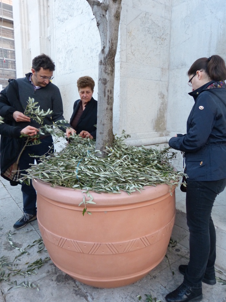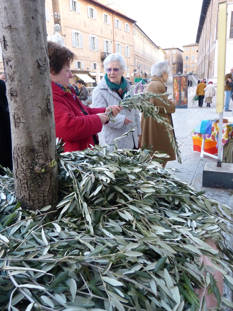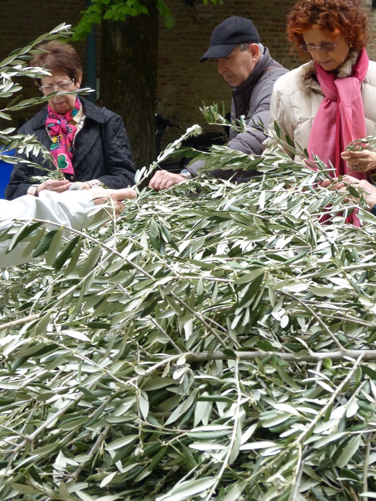 Today is Palm Sunday. In Italy the tradition is to collect a small branch from the church — once a palm (but Italy’s palms are dying) and now most often an olive — symbolizing the palms that were waved at Jesus as he entered Jerusalem.  The priest has blessed the branches.  And, carefully, to take it home.
