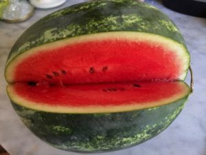 The Italian midsummer evening delight, cocomero, or watermelon, ready to dribble and drool all over yourself as you wander around the garden with slices in your hand and listen to the swallows and swifts as they dart through the sky.