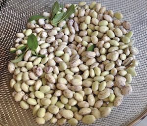 Fresh borlotto beans, all ready for boiling with sage, and then anointing with olive oil.