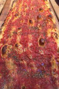 Pizza a taglio, Roman very thin pizza, is a year-round treat of course, but this July version is made with fresh tomatoes and just-picked oregano, and is perfumed beyond belief.