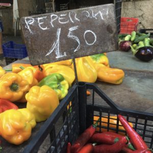 Ah, the peperoni of July, sweet and piquant ! The price is 1.50 Euro per kilogram.