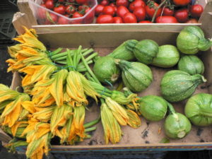 Note this round zucchini, the tondo chiaro di Nizza, perfect for stuffing with bread crumbs, onion and parsley and then baking. Note the zucchino’s elegant flowers, divine when fried Roman style with a frugal filling of anchovy and mozzarella.